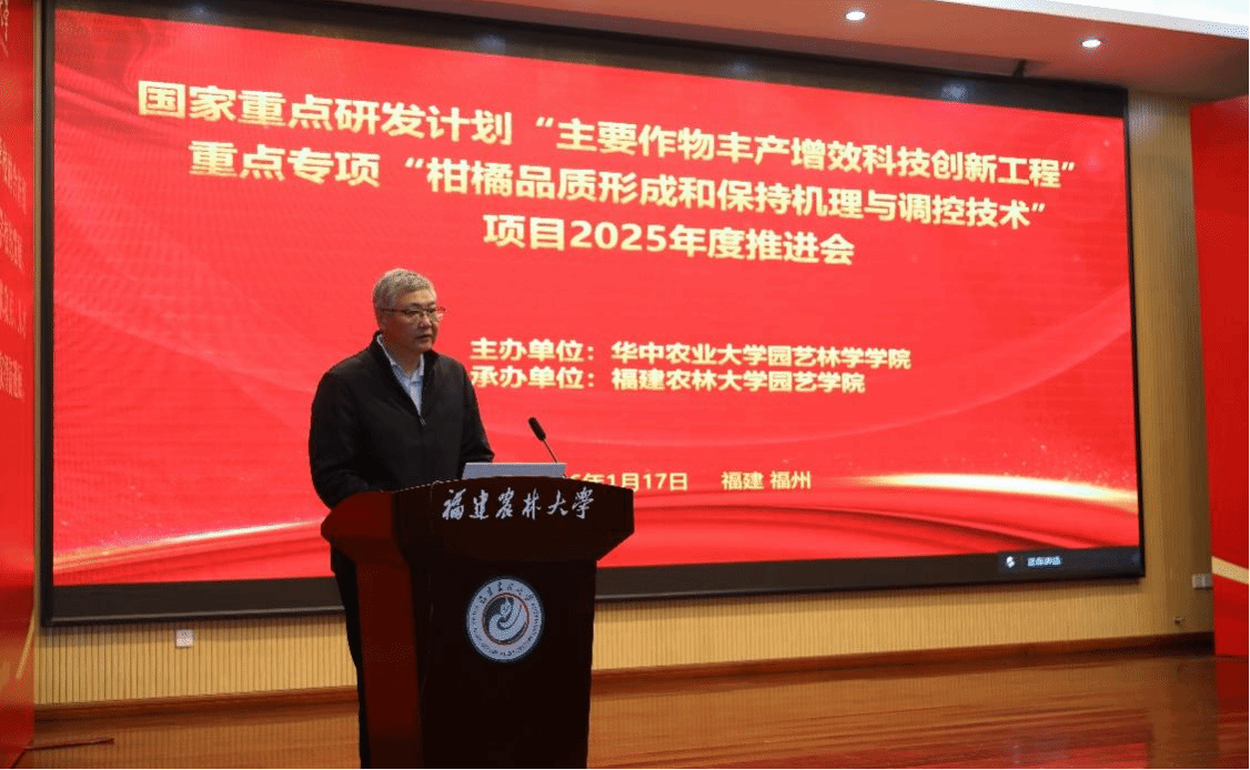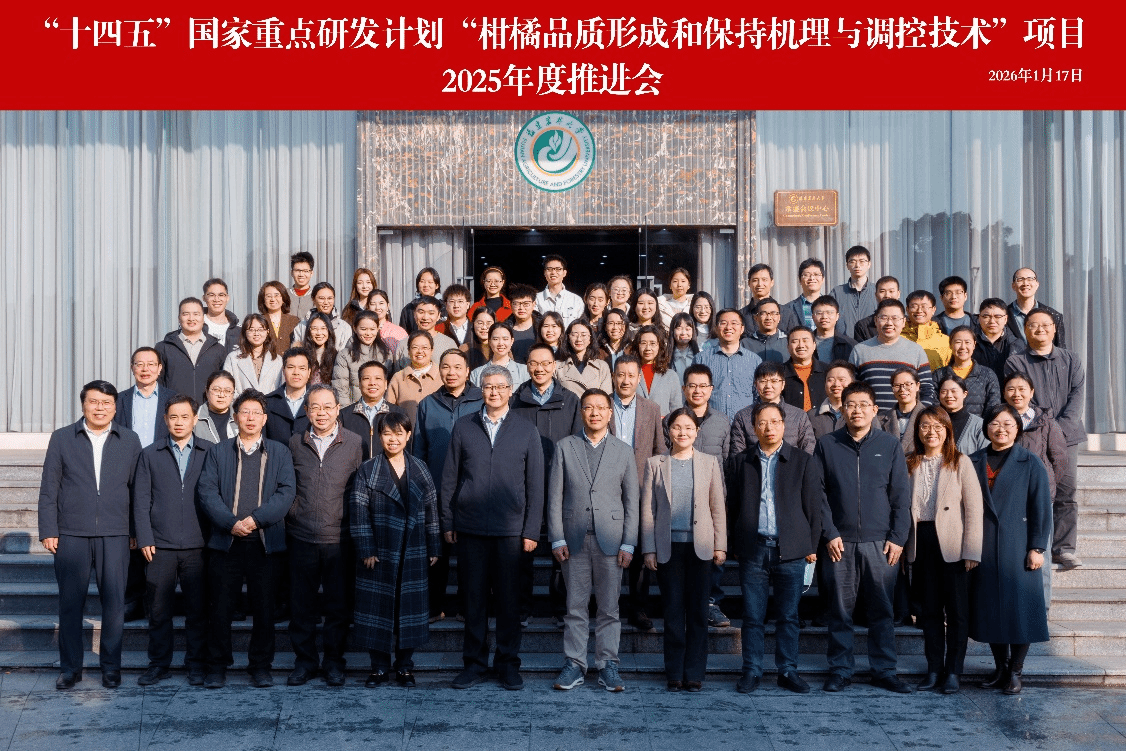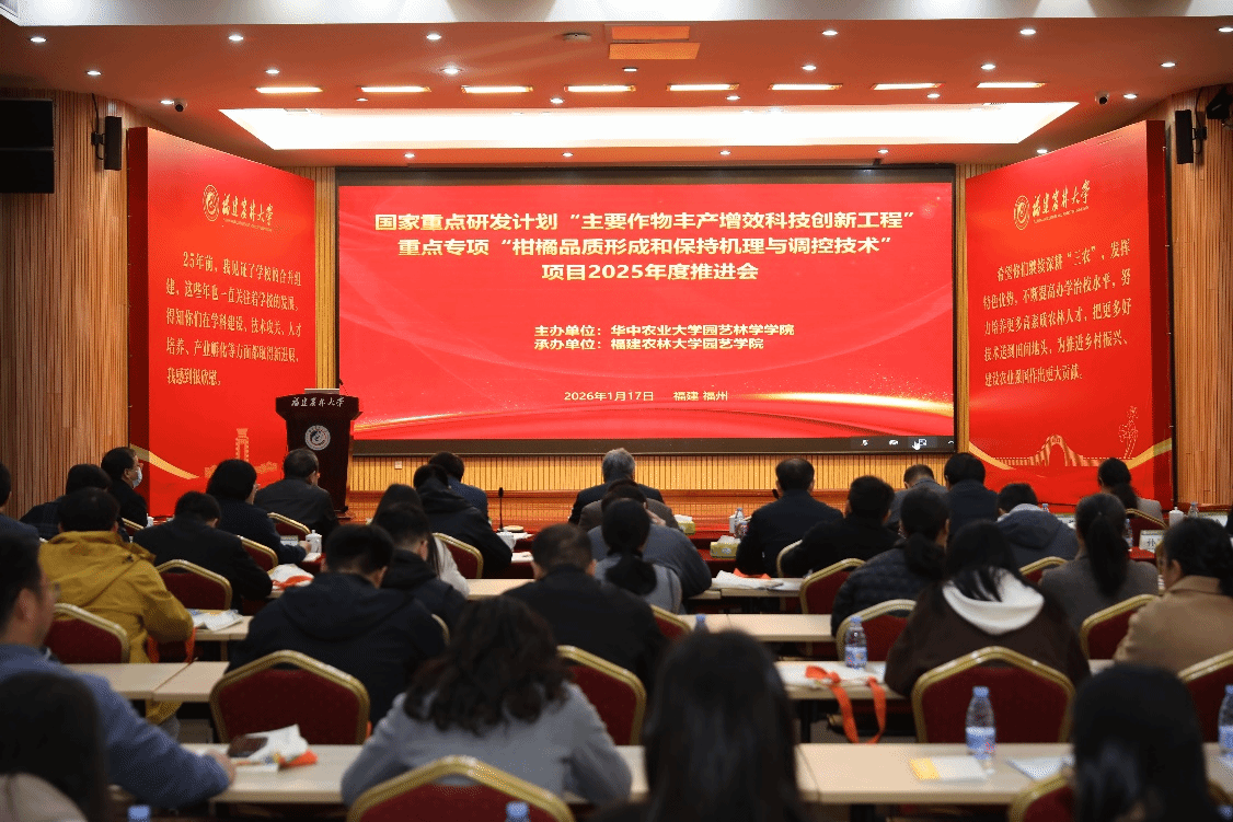 2026年1月17日,“十四五”国家重点研发计划“柑橘品质形成和保持机理与调控技术”项目2025年度推进会在福建农林大学召开。会议聚焦项目2025年度进展及后续工作开展,汇聚了行业内专家学者与科研骨干,为柑橘品质研究领域搭建了高效的交流协作平台。