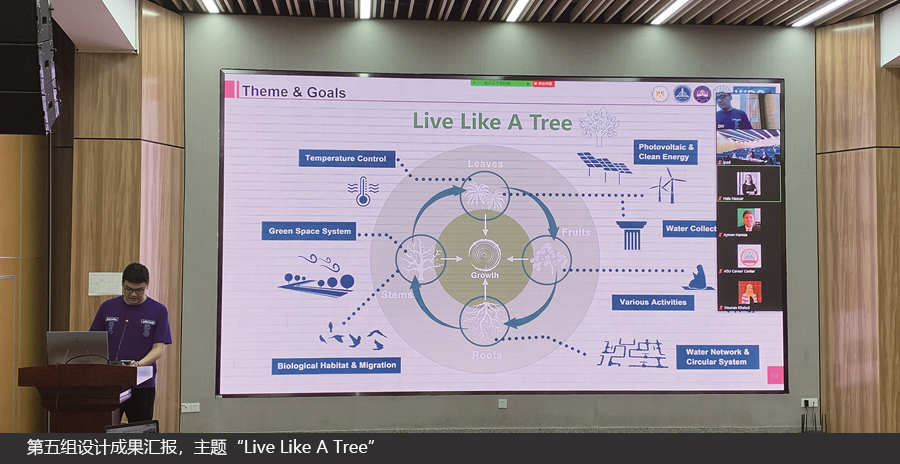 尝试将生态理念应用于沙漠地区,第五组以“Live Like A Tree”为主题,在城市设计中向“树”学习,模拟树的根、茎、叶、果,营造宜人的环境,打造梦幻的乐园、舒适的家园,实现人与自然的和谐共处。
