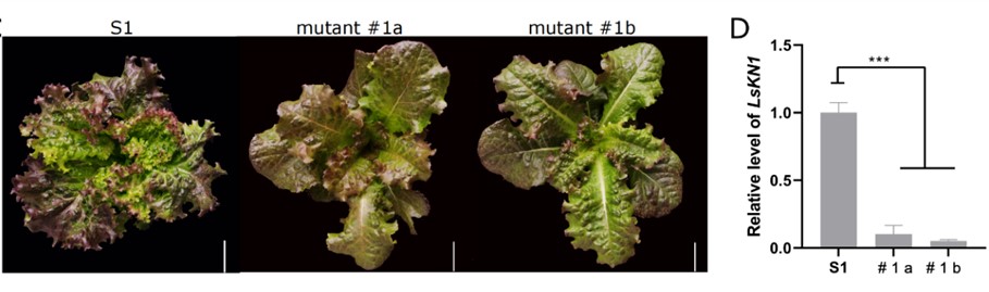 卷叶品种中LsKN1基因的上调表达是由第一个外显子上一个CACTA转座子的插入导致的。在本研究的遗传转化过程中,偶然获得了3株CACTA转座子发生转座的突变体,这3个突变体的表型由卷叶恢复为平叶,再次证明了LsKN1基因中CACTA转座子的插入是卷曲叶片形成的致变因子(图3)。该研究内容进一步丰富了叶发育理论,并为生菜遗传育种提供理论支持。