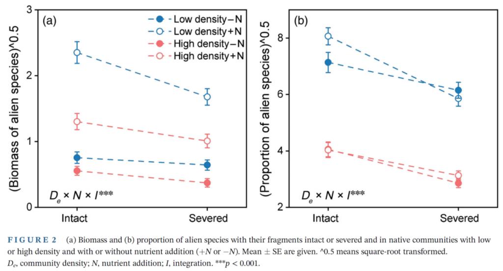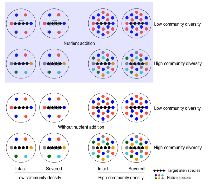 在全球变化背景下,植物入侵是生物因素(如植物物种的丰度和多样性)和非生物因素(如富营养化和特定环境中的资源可用性)复杂相互作用的结果。