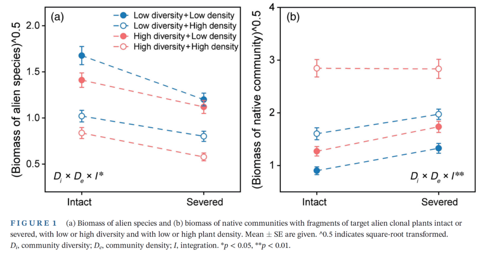 图1 不同克隆整合、群落多样性和密度处理下外来种和本地群落生物量