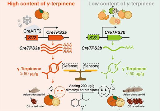 柑橘是全球最重要的果树类作物,在我国具有丰富种质资源。与粮食作物相比,柑橘果实积累了极高水平的挥发性萜类物质,不仅决定其独特风味,还深度参与防御性机制。其中,γ-松油烯赋予柑橘特有的“橘香味”,但其合成与调控的分子基础尚不清楚,限制了我们对柑橘风味和抗性改良的深入理解。