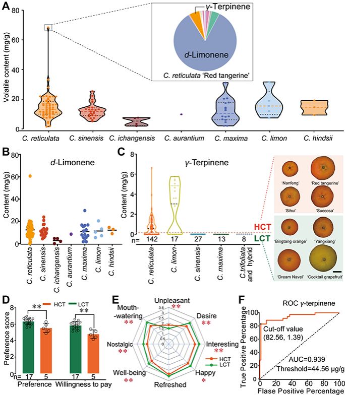 除作为柑橘背景香气的d-柠檬烯以外,橘积累较高的γ-松油烯,表现出典型的“橘味”,而甜橙及柚等其他大部分柑橘种质则并无该物质的积累。通过感官评价观察到柑橘果实中γ-松油烯含量的提升对消费者情感偏好及购买行为有负面影响。进一步,本研究对γ-松油烯感官阈值进行量化表征,发现高含量γ-松油烯赋予“臭橘子”味,而低于44.56 μg/g 时则呈现“橘香味”(图1)。