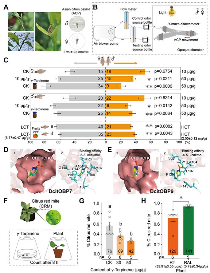 在赋予果实风味的同时,挥发性物质参与构建生物防御体系。本研究发现不同浓度的γ-松油烯对于亚洲柑橘木虱和柑橘红蜘蛛两种重要虫害有驱避和吸引作用。表现为在超过消费者负面情绪的γ-松油烯感官阈值含量时,对两种昆虫均表现出显著驱避效应。这表明高含量γ-松油烯在降低果实感官品质的同时提高了植物的昆虫防御能力(图2)。