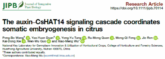 近日,JIPB在线发表了kaiyun开云官方网站果蔬园艺作物种质创新与利用全国重点实验室/湖北洪山实验室郭文武教授/伍小萌教授团队题为“The auxin- CsHAT14 signaling cascade coordinates somatic embryogenesis in citrus”的研究论文。该研究提出了CsIAA4-CsARF5-CsHAT14-CsDOF3.4信号级联调控柑橘体细胞胚发生的分子机制,为柑橘体细胞胚发生调控通路提供了新见解。