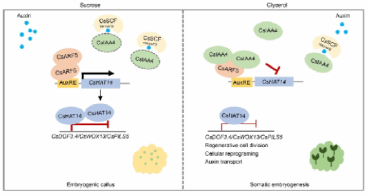 基于以上结果提出了一个工作模型:CsARF5通过直接激活CsHAT14表达,并借助CsHAT14对CsDOF3.4的抑制作用,阻碍柑橘愈伤组织体细胞胚发生。而生长素信号抑制子CsIAA4能与CsARF5互作,这种互作减弱CsARF5对CsHAT14的激活效应,最终促进体细胞胚形成(图2)。该研究明确了生长素信号级联在甘油培养基诱导柑橘体细胞胚发生过程中的分子机制,为解决生物技术用于柑橘种质创制的再生瓶颈提供了重要理论依据。
