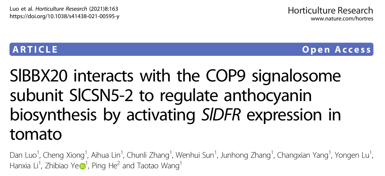 近日,kaiyun开云官网番茄团队发现超量表达SlBBX20 后花青素积累增多,提出了SlBBX20-SlCSN5-2互作调控番茄叶片花青素积累的模型,该研究揭示了光诱导花青素生物合成的一个新的调控途径。相关研究成果发表在国际学术期刊Horticulture Research上。
