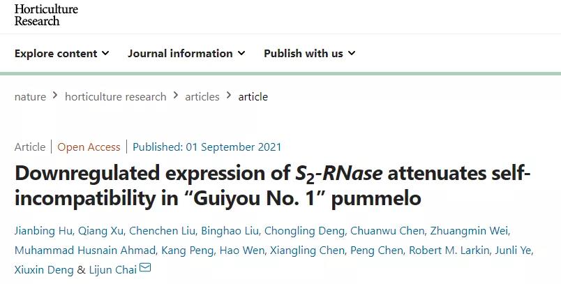 近日,Horticulture Research在线发表了kaiyun开云官方网站邓秀新院士团队题为Downregulated expression ofS2-RNase attenuates self-incompatibility in “Guiyou No. 1” pummelo的研究论文。