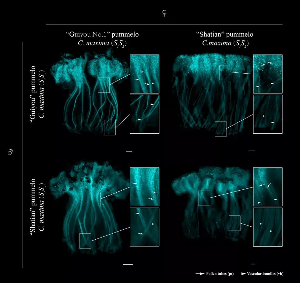 课题组前期已通过正向遗传学等手段首次阐明控制芸香科柑橘自交不亲和机制属于S-RNase酶介导的配子体自交不亲和类型(Liang et al.,Nature Plants, 2020)。本研究以自交亲和沙田柚优良变异株系——“桂柚1号”为材料,不同于沙田柚具有典型的配子体自交不亲和特性——自交坐果率极低,“桂柚1号”则表现出稳定的自交亲和特性,生产上无需人工授粉。研究者对沙田柚和“桂柚1号”经过连续两年的自交授粉及坐果率观察,证实了‘桂柚1号’的自交亲和表型稳定,授粉5天后,其花粉管可以完全到达花柱基部。人工自交授粉,“桂柚1号”的坐果结实率可达30%。而两者相互杂交授粉结果表明,沙田柚的花粉在“桂柚1号”的柱头上也表现出稳定的亲和性,而“桂柚1号”的花粉在沙田柚的柱头则表现为不亲和,由此表明,“桂柚1号”亲和突变发生在花柱端。S基因型鉴定结果表明“桂柚1号” 与沙田柚均为S1S2,对“桂柚1号”自交子代基因型鉴定结果表明,其子代基因型S1S1:S1S2:S2S2的分离比为0:1:1,结合RNA-Seq及qRT-PCR分析,发现S2-RNase基因在“桂柚1号”花柱中完全不表达,且Western Blot结果也证实,在“桂柚1号”花柱中未检测到S2-RNase蛋白。以上结果表明,S2-RNase基因的不表达是造成“桂柚1号”自交亲和的原因。