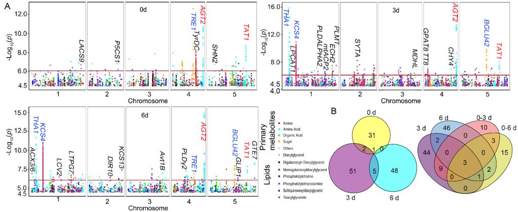 本研究检测了252份拟南芥自然群体材料经黑暗处理(模拟柑橘等园艺产品采后贮运条件)后初生代谢物及脂质含量,发现以糖及有机酸酸为代表的可以直接参与TCA循环供能的代谢物在黑暗处理后迅速下降,其可能作为黑暗诱导衰老早期响应物行使功能。支链氨基酸、色氨酸、酪氨酸等在黑暗处理前期因蛋白质的降解而逐步积累,而在黑暗处理后期通过降解途径为TCA循环提供底物,并直接为线粒体电子传递链提供电子等含量逐步下降。这些代谢物则作为黑暗诱导衰老的后期响应代谢物。此外,本研究基于3个时间点及各时间点的代谢物差异所开展的动态mGWAS鉴定到了参与营养物质再循环途径中代谢物降解、代谢物转运及行使转录调控效应等关联基因。深入的遗传调控机制解析发现TAT1对酪氨酸含量在正常和黑暗处理后存在不同遗传调控机制:在正常情况下,TAT1编码区能改变其蛋白序列的5个SNP差异导致了TAT1蛋白酶活的差异,从而影响不同材料酪氨酸的含量差异;在黑暗情况下,启动子区域5个SNP的差异影响了TAT1的表达量而进一步影响酪氨酸在群体中的含量差异。此外,参与苏氨酸代谢的THA1及甘氨酸转运的AVT1B也因启动子区域的SNP差异引起的表达差异而影响了相关代谢物在群体内的差异分布。本研究运用多时间点的动态mGWAS方法全面解析了拟南芥黑暗所诱导的衰老下初生代谢物及脂质再循环的遗传调控机制,鉴定的营养再循环相关基因为改良果实的物质循环及特定代谢物含量,维持果实采后品质提供了重要的理论参考。