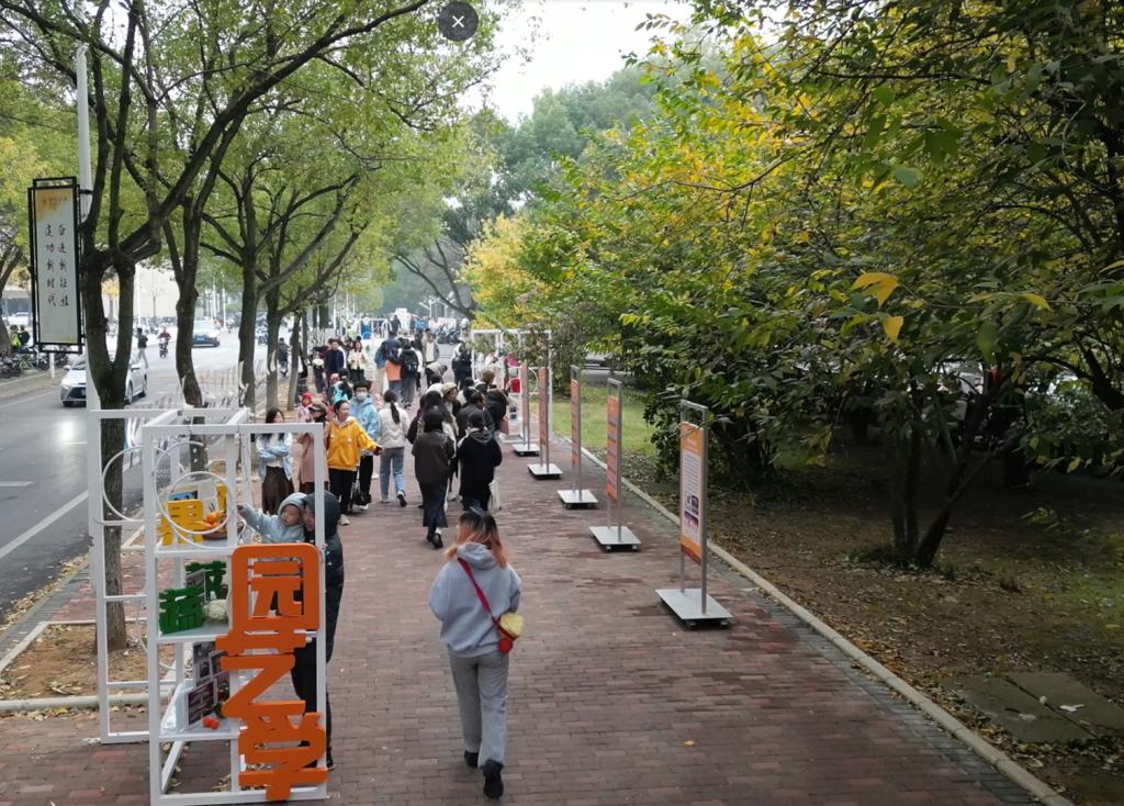 从主会场到狮子山广场分会场沿路是园艺学科展示区,通过图片、文创用品、展架、园艺产品等元素,将学科文化、学术风采、园艺人文三个部分呈现开来,展示了园艺学科研究成果、师资力量、科研团队、学术活动、社会服务等内容。“把课堂搬进田间地头!”一张张照片,透视出农学人不辞劳苦,躬耕田园的精神面貌。