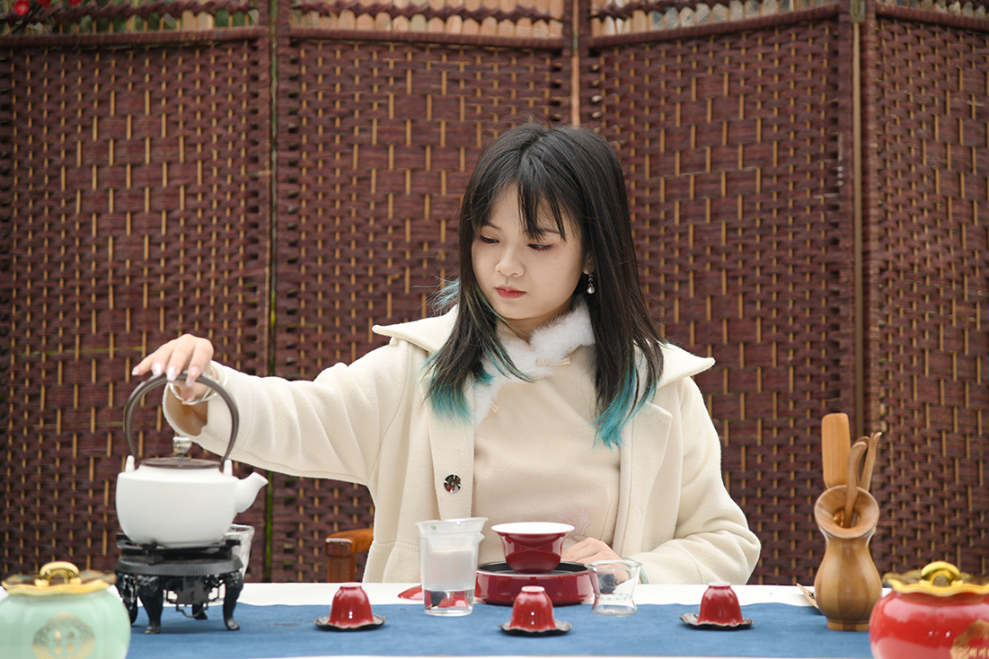 “得闲煮茶,饮尽风雅”,清幽明净的古风音乐响起,在传统茶艺展示区,由茶学团队培养的硕士研究生王淑腾姿态优雅、神情宁静、行云流水,她以娴熟的技法展示了中国传统茶艺。清亮的茶汤从古朴精致的茶具中倒出,分送到大家手上,八年老白茶入口丝滑甘醇,余韵悠长。参与者在品味岁月的沉香的同时,感受着博大精深的传统茶文化。