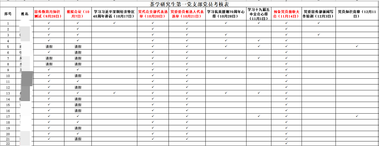 支部建立支部党员考核表,监督党员履行义务;邀请入党积极分子参加支部活动,在广泛听取同学意见的同时,制定了推荐拟发展对象评分细则,规范入党程序,提高了入党过程的公开透明度。