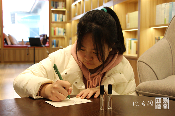 在香水的调制上,志愿者们想法不一。一位来自园林院的学生选用了柠檬精油与香水专用酒精调制香水;一位公管院的学生配制的一瓶香水借鉴了PPT中配方所配,另一瓶则按照自己的想法想搭出神清气爽的感觉。此外,大家还在明信片上写下对考研学长学姐的祝福。这些祝福卡片将与香水一起,由工作人员送给即将考研的学长学姐们。