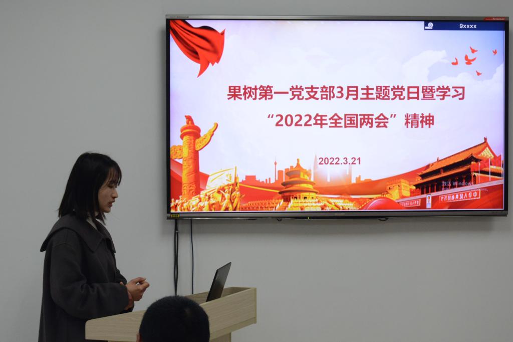会议第二项,党支部书记伍依芳同志就“学习2022年全国两会精神”这一主题进行了领学。会上,伍依芳同志结合短视频生动形象地为大家介绍了2022年全国两会基本要义及热点话题,带领大家深入学习两会精神。在主题党日活动结束之余,伍依芳同志还特别强调:“共产党员不信教是政治纪律”,共产党员不准信仰宗教,但应关心党的宗教工作、执行党的宗教政策。
