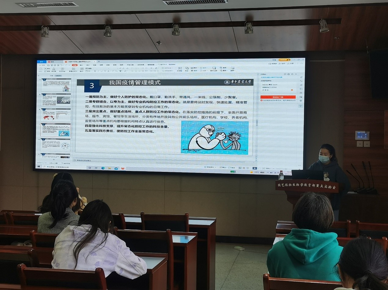 清明假期将至,而多地新增新冠确诊病例数量有所上升,防疫形势严峻而复杂。为进一步增强同学们的疫情防控意识,保障防疫工作顺利有序进行,2020级蔬菜学硕班于3月28日在园林南楼204会议室召开疫情防控主题教育班会。班会由班长贾学菊同学主持。