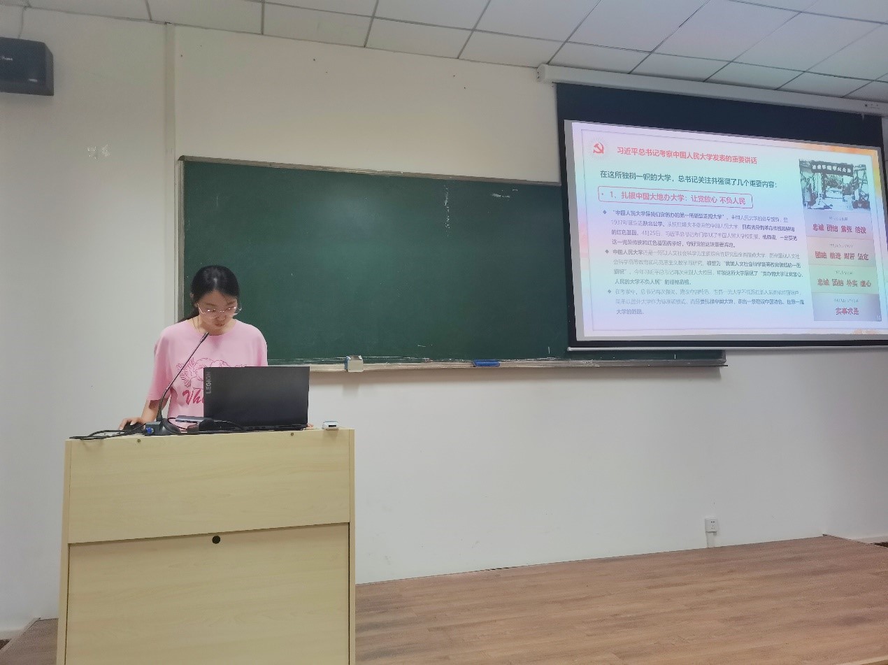在专题学习之前,支部党员集体重温了入党誓词。之后,李岑枫同志首先带领大家学习了习近平总书记考察中国人民大学发表的重要讲话精神,并从五个方面对习近平总书记的考察讲话进行了总结与提炼。其中习近平总书记对广大青年的寄语更是让在座党员同志们深受鼓舞。