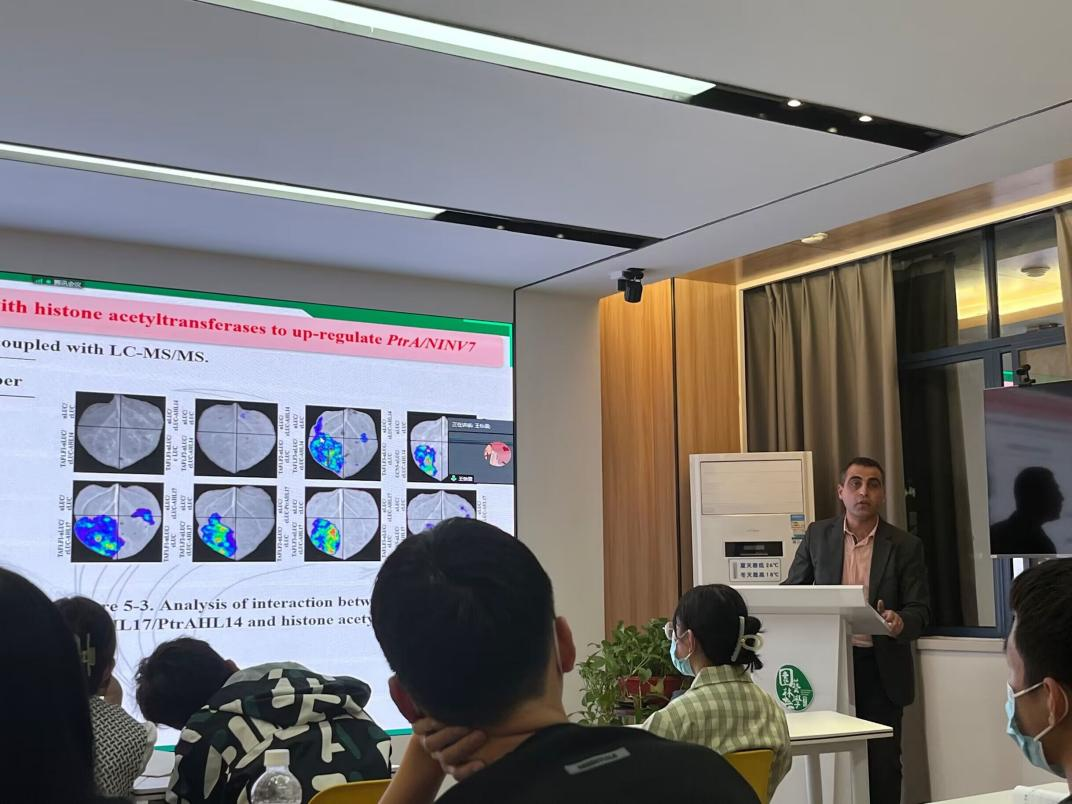 巴沙尔博士在本次的交流会当中向同学们介绍了自己现阶段的柑橘耐寒性研究。他讲解了自己在研究过程当中的技术路线,图文并茂地展示了他在实验三个阶段中得出的结论,进一步阐明了柑橘PtrINV基因对低温响应的基因表达分析、柑橘品种较高的含糖量和可溶性转化酶活性与抗冻性之间的关系等理论。