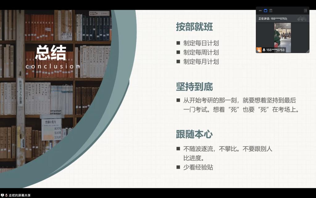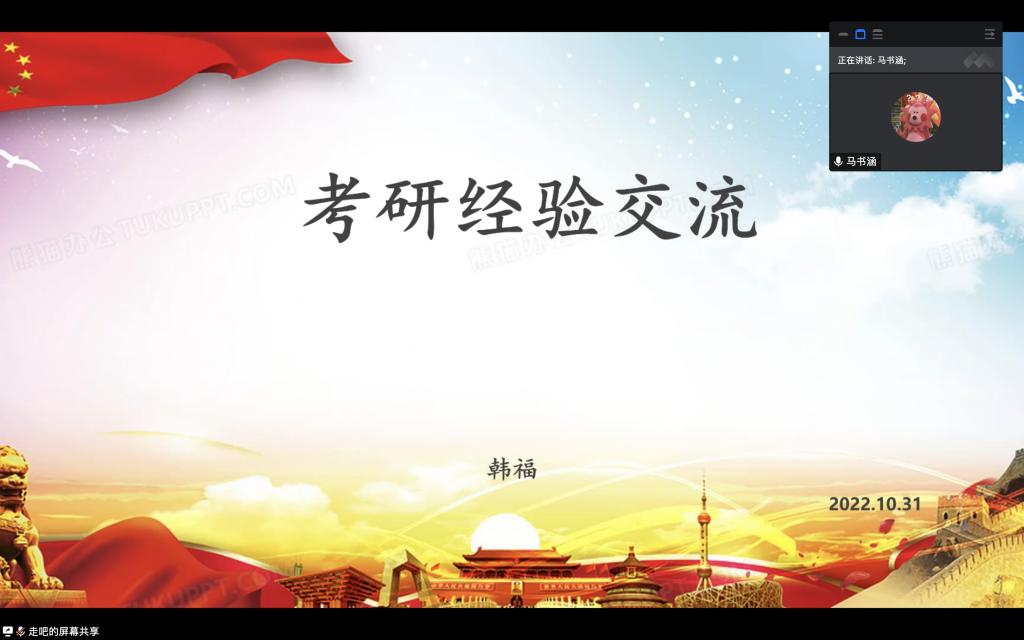 会议伊始,宁瑶瑶同学以“星光不负赶路人”为题,从个人信息、择校思路、各科经验及研究生生活四方面分享本科当时的研途探索及现在研究生的科研生活,为同学们提供她在研途探索中的经验与建议。宁瑶瑶强调:大家应该制定自己的计划,不要盲目和别人比进度,贵在坚持。接着韩福同学从专硕、学硕区别的角度出发,详细介绍了考研科目的区别及资料准备情况,强调教材不宜过多,精读更为重要,做笔记时切忌自我感动,各类知识点要及时复盘,同时保持积极向上的乐观心态,正确面对压力与挑战,以学到知识为目的,会让你收获到加倍。最后,进行交流会的提问环节,宁瑶瑶和韩福两位分享者对同学们提出的关于考研经验贴、四六级成绩在复试中的占比、学习时间安排、校园生活等问题进行一一解答。