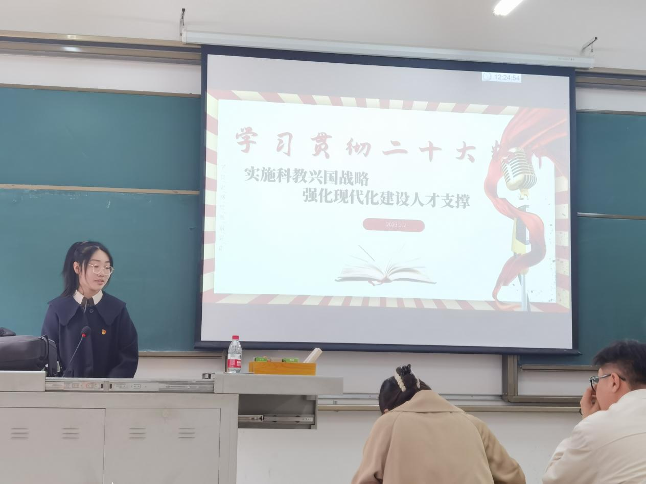 在本科生“精读精讲”宣讲团成员董晓玲的带领下,与会成员认真学习贯彻党的二十大精神。“教育、科技、人才是全面建设社会主义现代化国家的基础性、战略性支撑。必须坚持科技是第一生产力、人才是第一资源、创新是第一动力,深入实施科教兴国战略、人才强国战略、创新驱动发展战略,开辟发展新领域新赛道,不断塑造发展新动能新优势。”董晓玲提到,“作为新时代青年,我们肩负民族复兴的时代重任,我们要坚持与祖国同行、为人民奉献,发挥党员先锋模范作用,利用自身专业优势,服务人民,报效祖国”。