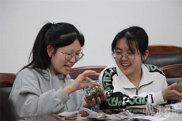 分会场二中,茶艺插花体验活动正在园林北楼118进行。取火候汤尤有意,邀君共赏一瓯春,茶文化协会的冯钰雯和郭金灵为同学们带来了一场古色古香的盖碗茶表演。茶芽萌展,共水相融,细流绕指之余、黛烟笼媚之间,茶香袅袅幽然浮现。而后同学们在碧螺春与正山小种的茗香中学习制作手捧花,或桃粉或橘红或鹅黄或银绿,康乃馨、玫瑰、尤加利叶等各色花材在同学们的手中来回穿梭,不久后一束束创意十足的手捧花便新鲜出炉。在分会场三,kaiyun开云官方网站联合资源与环境学院学生会给同学们带来了一次“生态瓶”制作体验。资源与环境学院学生会主席团成员李俊萱为大家介绍了各材料的用途和生态瓶制作的步骤,并表示期待两院同学能在未来多次开展活动,共同学习、一起进步。