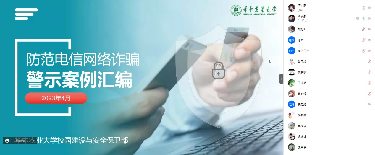 4月23日晚,20级园林硕士班开展了安全教育主题班会。班长严宇航首先向班级同学介绍了高校易发,高发电信网络诈骗9类案例,并表示冒充商家或客服是身边最容易发生的网络诈骗情况之一,告诫同学们警惕相关诈骗电话。