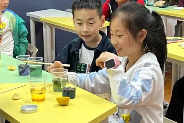 在“色彩心情”小实验中,小朋友们将几朵蝶豆花加入在温水中,酝酿出蓝色的茶汤,大家好奇地加入新鲜柠檬汁、纯碱等材料,茶汤缓缓呈现出紫色、蓝色,小朋友们惊喜连连,高兴地与老师、志愿者分享。颜色变化很快完成,大家却意犹未尽,于是发挥想象力,创造了环节中没有设计的实验现象。
