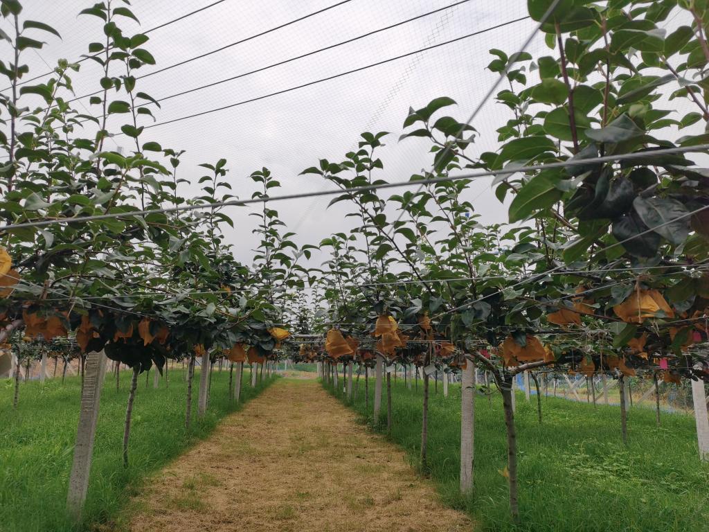 为更加深入了解“双臂顺行式”梨栽培模式的研发与应用,实践小队一行人又驱车前往果茶所江夏基地梨科技示范园,在这里,实践小队参观了“双臂顺行式”棚架梨各个研发时期的架式与应用,并在产区管理员的带领下,参与了梨果采收、拉枝等生产活动。