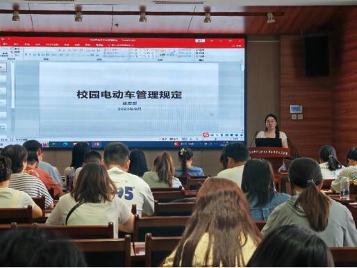 会议后半段,陈炫希老师将关注焦点转向了电动车的安全问题。针对当前校园电动车乱象,她强调了电动车实名制带来的益处;随后,她详细阐述了电动车骑行的“六不准”原则,并提醒同学们要严格遵守规则,确保骑行的安全性和规范性,共同维护校园出行安全。