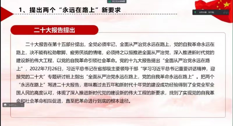 会上,同志们认真学习了“习近平总书记关于全面从严治党的重要论述”,深刻理解新征程全面治党的新部署,包括两个“永远在路上”的新要求、健全全面从严治党体系的新思路、全面从严治党的新观点以及新举措等。王熙悦谈到,党的二十大报告指出,必须持之以恒推进全面从严治党,深入推进新时代建设新的伟大工程。与会党员认识到新征程是充满光荣和梦想的远征,党的建设新的伟大工程,是引领伟大斗争、伟大事业、最终实现伟大梦想的根本保证。