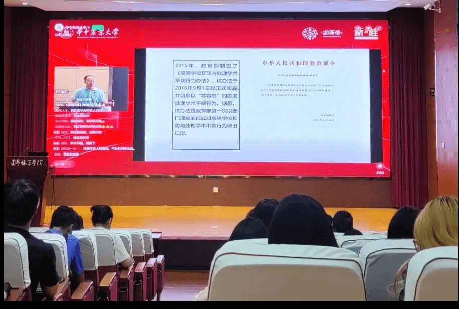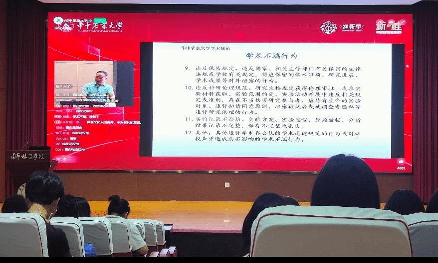 张院士指出,学术道德与科研诚信规范和制度化教育需要进一步完善,同时需要在文化建设上下功夫,建立和完善刚性的学术不端处罚制度,提倡与推广“交通法规式的学术治理体系”,推行问责制度,在国家层面强调“学术诚信”。最后,张院士以“风清能气正,致选赖行稳,规范讲诚信,方我华农人”为结语,激励新生严守学术道德、端正学风。