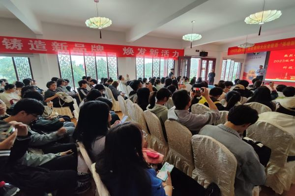 在李国怀老师的讲解结束后,同学们前往桃花岭的报告厅听取桃花岭生态园创始人吴明国的讲话。吴明国先生向同学们亲切地分享他带领当地村民拓荒改造的创业经历,并介绍了其企业的“三牛”文化,即孺子牛、拓荒牛、老黄牛,以亲身经历向同学们讲述了一堂生动的思政课。他特别强调大学生尤其是研究生应当珍惜时代,把握青春,将自己奉献到乡村振兴之中。讲话引发同学们深刻反响,深深激励了同学们。