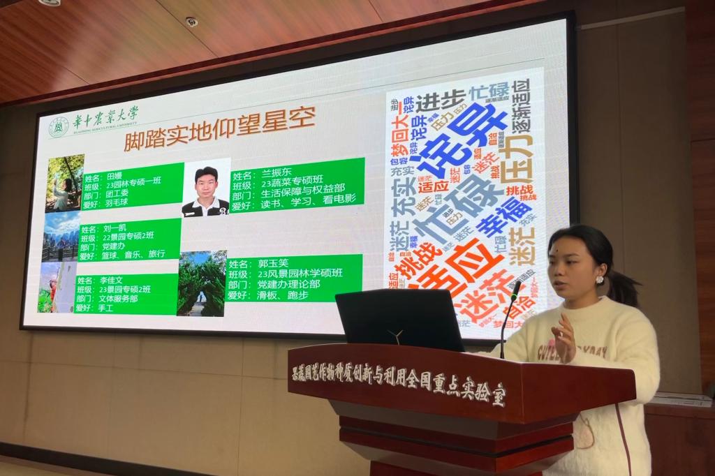 5号成长小组的汇报主题是“脚踏实地仰望星空”,用“忙碌、适应、诧异、幸福”等词汇概括了这两个月以来的成长体会。