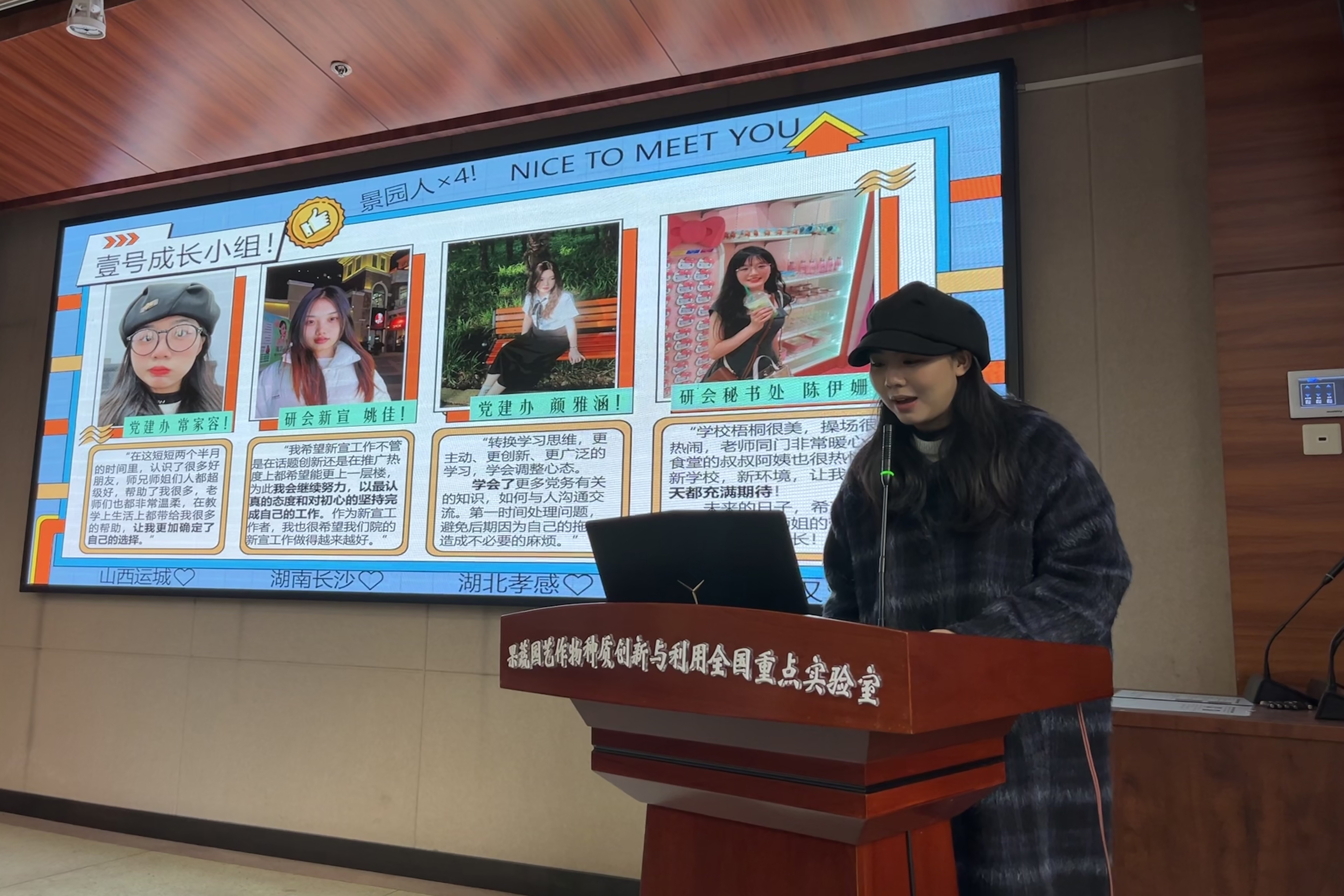 1号成长小组利用“初次见面很高兴”作为主题,介绍了团队成员以及近阶段在学生工作中的成长体会,并希望在未来能够有所进步。