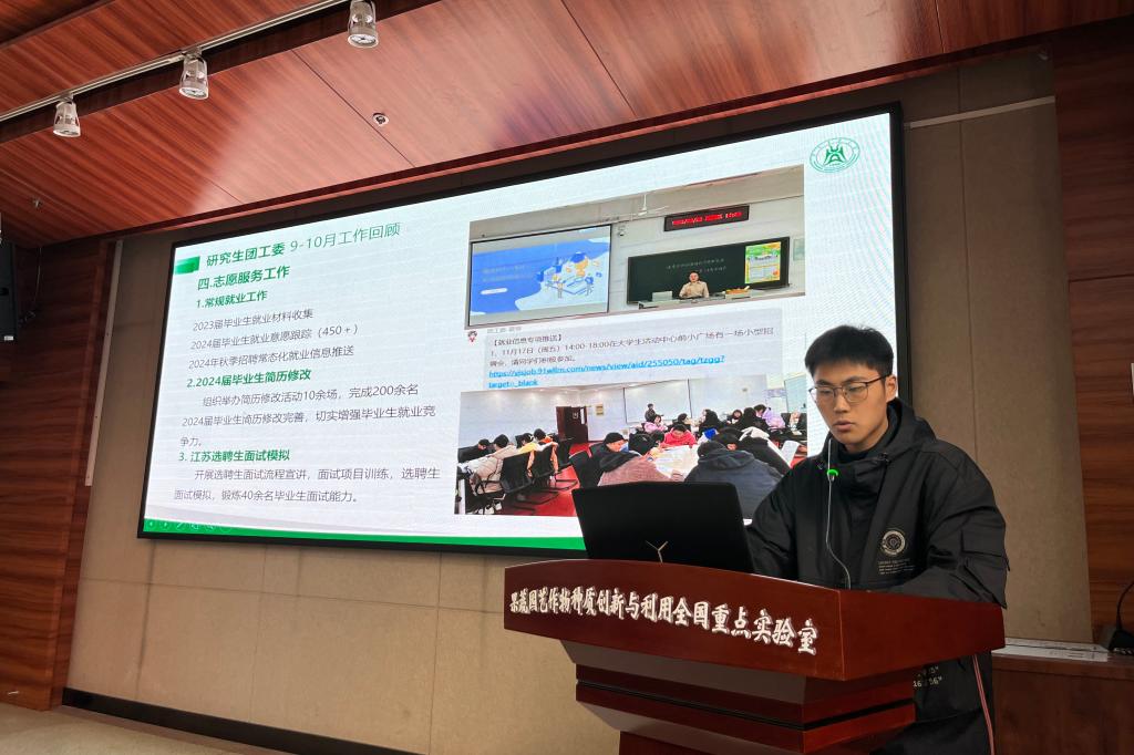 会议第二项,党建办主任闫昱升,团工委副书记管宪宽,研究生会主席团李贵华,科学与技术协会主席黄婧婷对近阶段的学生工作开展情况进行总结汇报并交流了工作感想。