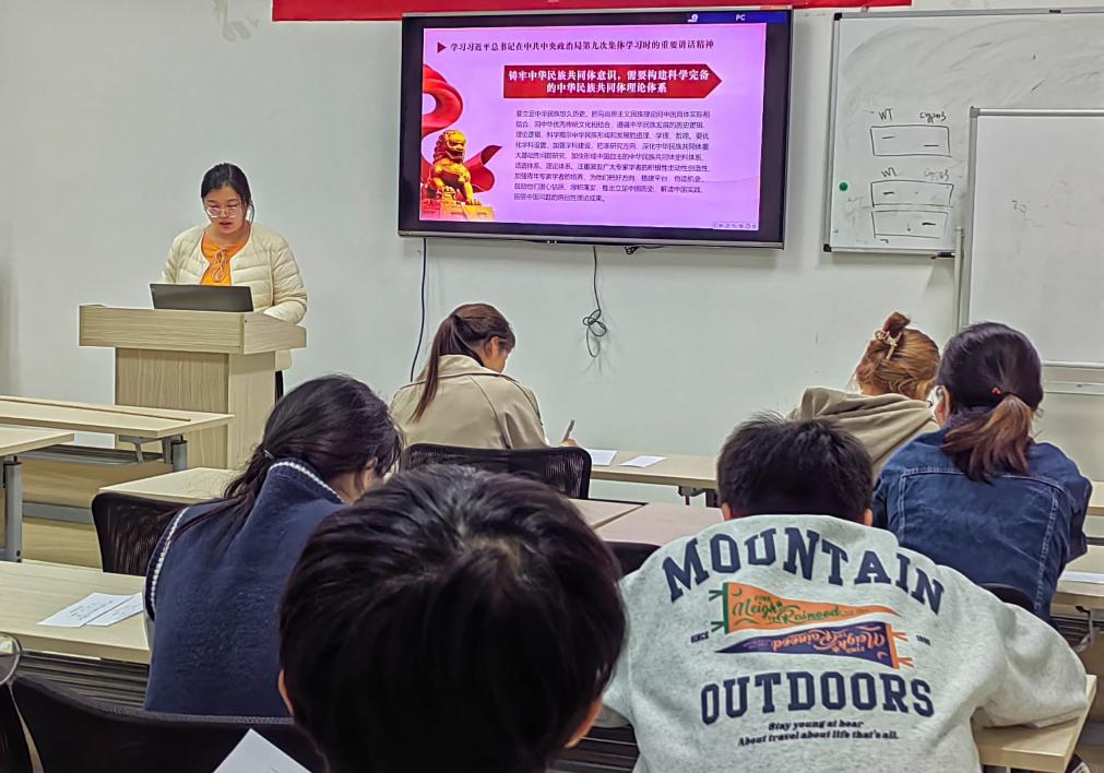 会议伊始,支部书记张梦晴带领支部党员学习了习近平总书记在中共中央政治局第九次集体学习时的重要讲话精神以及习近平总书记致欧美同学会成立110周年的贺信精神。张梦晴同志谈到,要铸牢中华民族共同体意识,推进民族工作高质量发展。倡导同志们要牢记自信自强、开拓奋进、开放包容,以坚定信心信念激发前进动力,以顽强奋斗精神担当民族大任,当好促进中外友好交流的桥梁纽带。