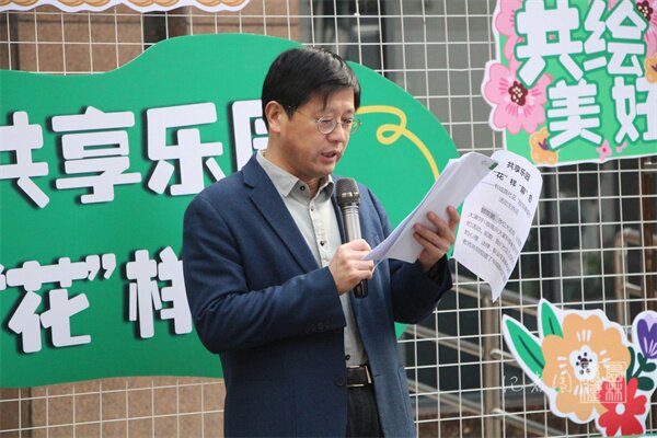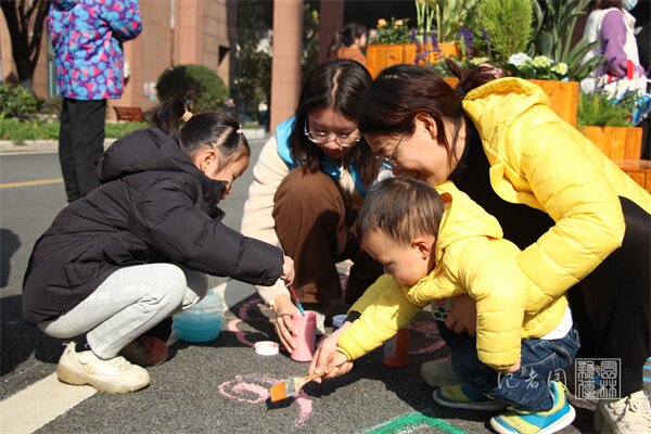 家长与孩子在志愿者的指导下合作种植花卉,家长用铁锹将土拨开,孩子共同将一株鹤望兰放入土中,然后将周围的土壤压实并浇水。亲子种花的同时,家长给孩子们讲述着鹤望兰的外观特征和生长习性,。四个花箱组合花卉全部栽种完成后,“书叙之声”团成员兼解忧专家朱淑艳引导现场居民们分享参加此次活动的感受,并进一步讲解了如何在日常生活中保持心理健康。活动最后一个环节为共绘乐园,由志愿者讲解地面彩绘框架的设计初衷并引导亲子家庭开展彩绘地面活动。活动结束后由志愿者对活动现场进行清理。