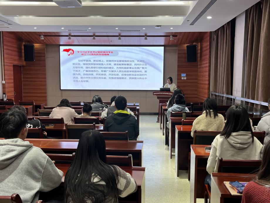 会议伊始,刘冉同志带领同志们学习了习近平总书记在中共中央政治局第九次集体学习时的重要讲话精神及习近平总书记致欧美同学会成立110周年的贺信精神。她谈到,我们要铸牢中华民族共同体意识,要引导各族人民牢固树立休戚与共、荣辱与共、生死与共、命运与共的共同体理念,同时也应当积极投身于创新创业创造时代洪流,助力中外文明交流互鉴。全体党员同志应以贺信精神为指引,在求学世界中为全面推进中华民族伟大复兴贡献更多智慧和力量。