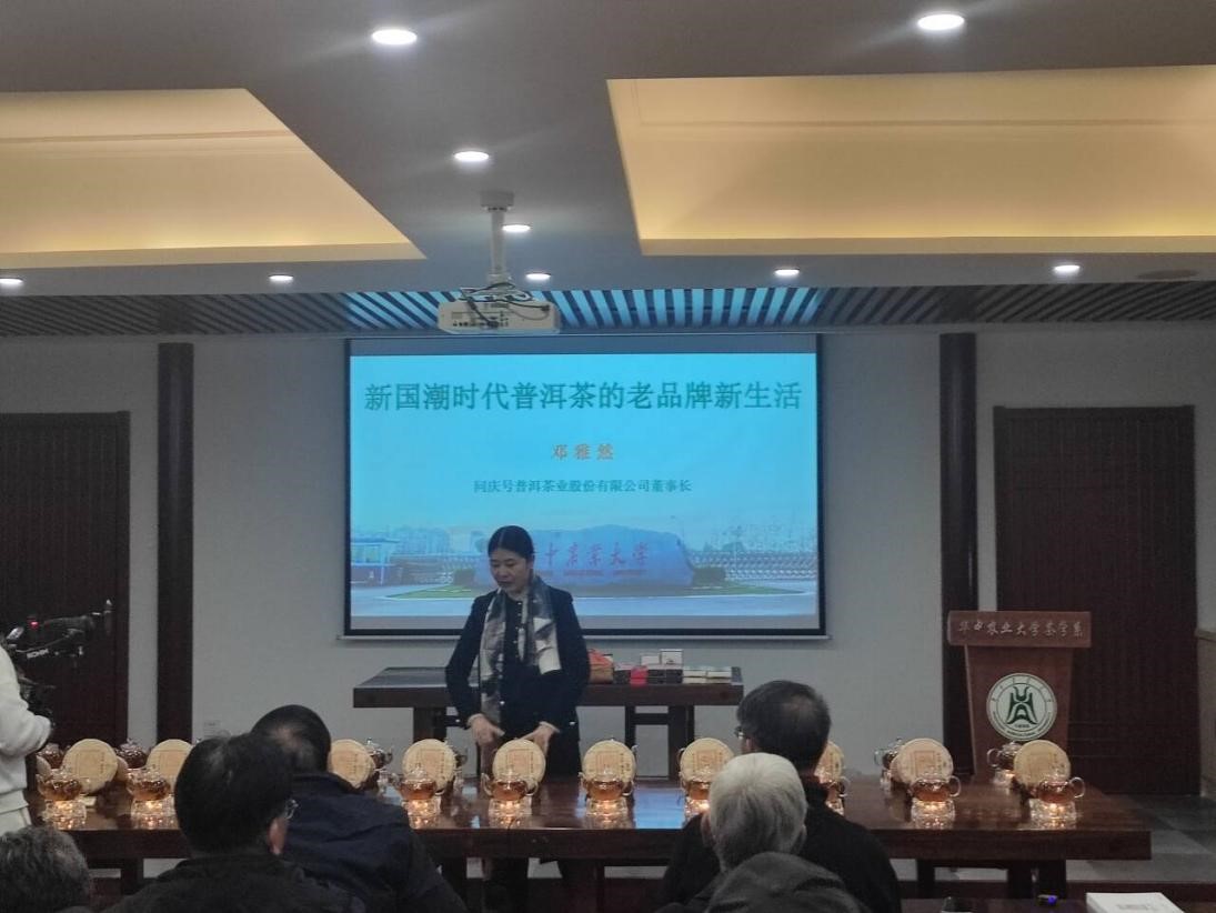 11月12日,kaiyun开云官方网站“新国潮时代普洱茶的老品牌新生活”交流会在园林北楼226耕读茶室顺利开展。本次活动邀请了西双版纳同庆号普洱茶业股份有限公司董事长邓雅然。她将以自己的亲身经历讲述与普洱茶结下的深厚情缘,让同学们了解普洱茶的真实发展现状。在新国潮背景下,是如何将普洱茶老品牌融入当代年轻人的生活方式。