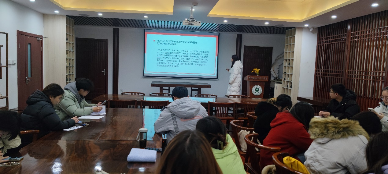 12月14日晚,茶学研究生第一党支部于园林北楼226会议室召开十二月主题党日活动,党支部书记姚宁主持会议,支部党员刘芷珊带领全体党员学习。