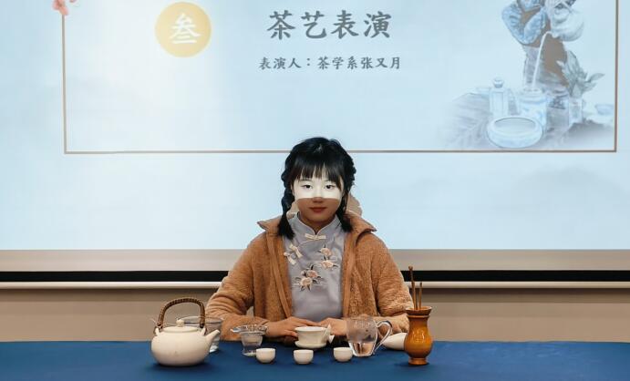 为进一步引导同学们深入认识茶叶知识,体验我国茶道文化的独特魅力,茶学系的学生张又月精心策划并表演了一场茶艺展示。在悠扬的古筝音乐伴奏下,张又月同学端坐于茶桌之前,为在场的同学们演示了茶艺的各项环节。从赏茶、温壶、洗茶,到冲泡、闻香……一步一步地引领同学们沉浸在茶香四溢的氛围中,深刻感受到了中国茶艺文化的深厚底蕴。展示结束后,现场掌声不断。