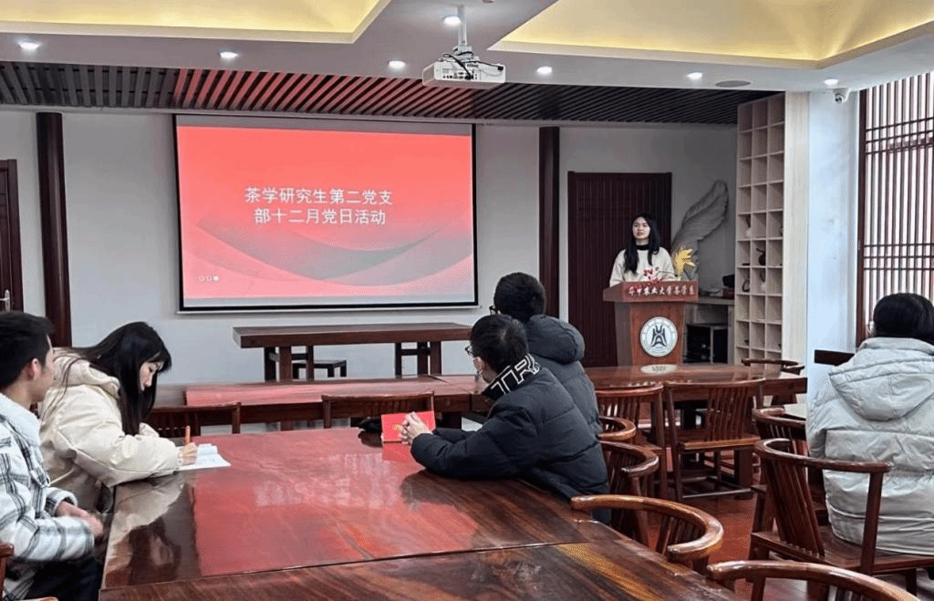 12月29日,茶学研究生第二党支部在园林北楼226耕读茶室开展了十二月主题党日活动,会议由党支部宣传委员刘珈彤主持。