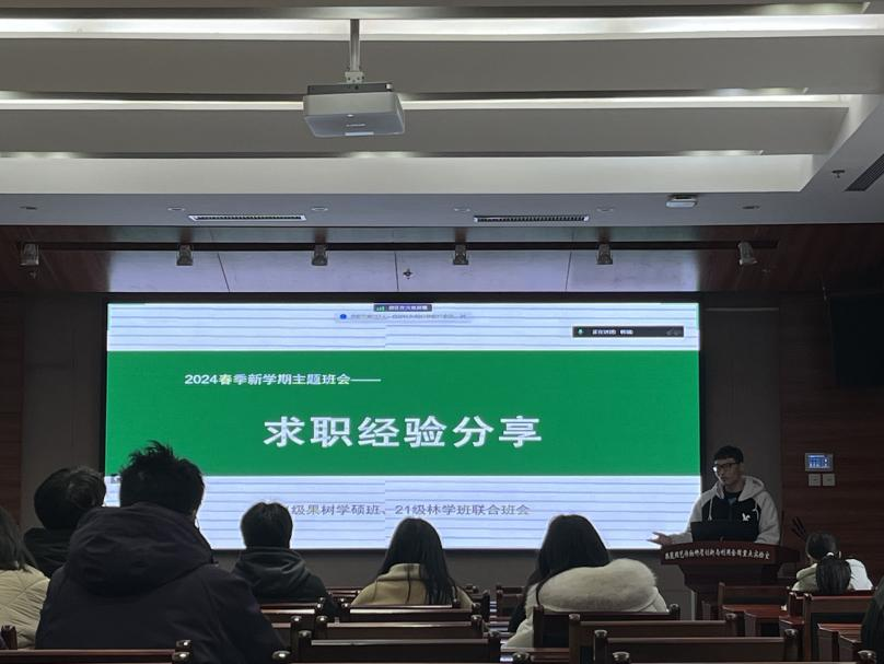 2月29日下午,学院21级林学班与21级果树学硕班在园林南楼204召开2024年第一次班会,辅导员孟悦老师参会,班会由21级林学班班长刘旭婧主持。本次班会旨在为同学们提供了解求职过程、分享求职经验心得的机会,激励大家在未来的求职路上勇往直前。