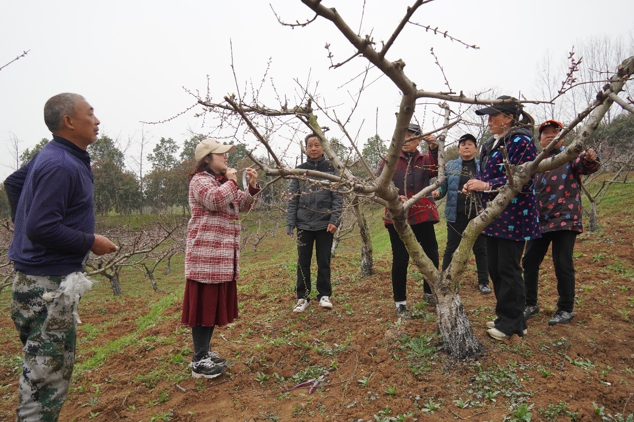 图为研究生毕娇娇向农户讲解桃树春季管理相关技术