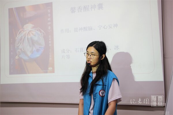 在介绍香文化前,项之彦向小朋友们解释了非遗的概念,并以雕刻工艺、瓷器制作工艺为例与物质文化遗产进行区分。随后,项之彦介绍了“香”字的起源与发展,形象生动地说明了“香”的概念是如何演变成如今被普遍认同的“香指代一切好闻的、令人愉悦的气味”。