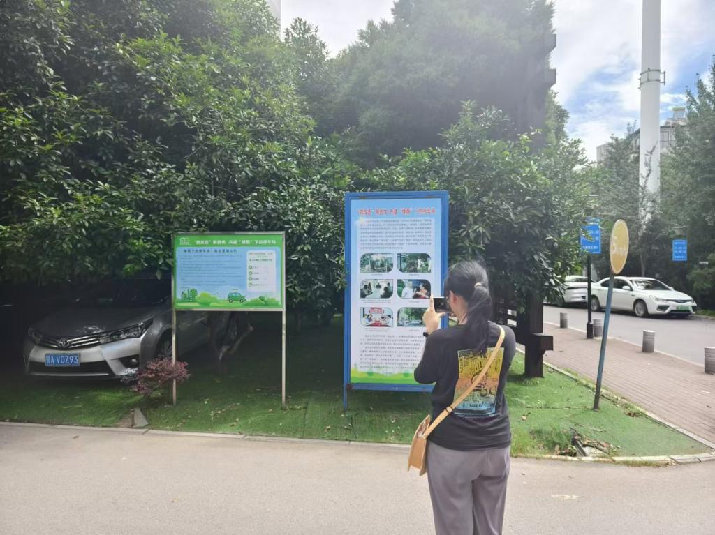 团队首先来到江欣苑社区,了解社区推进共同缔造微改造、微心愿、微服务、微空间、微治理的工作内容。在走访过程中,团队发现了社区宅前空地或者废弃空间上由群众参与的“绿荫”下停车场、社区花园、科普长廊等 “微空间”、“微改造”项目成果。车辆停放俨然、宅前种植各色灌木植物、各处角落树立治理公约宣传栏,改造后的小区环境焕然一新,不仅改善了停车位不足、基础设施难以满足各年龄层居民的活动需求等实际问题,还通过可移动花园、蔬果花园、芳香花园、药草花园、花溪小径等提升小区景观效果。这些项目成果为居民提供寓教于乐的美好生活空间。