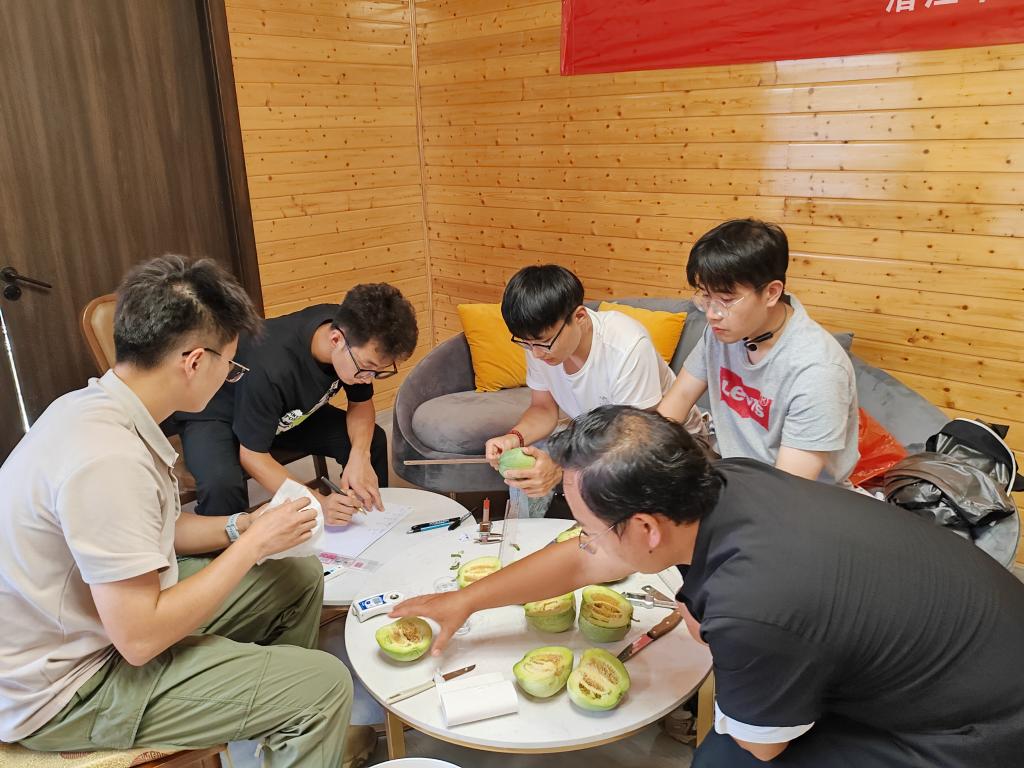 调研前期,团队成员在整个甜瓜的重要生产节点一直入驻科技小院,扎身一线生产,从事整地、育种、定植、浇水、施肥、除草、掐头、疏果,观察长势,预防虫害,田间数据采集等,深刻了解了甜瓜种植管理的整套流程。除此之外,团队成员还了解了科技小院内各种果树的管理方式,对科技小院的种植模式有了切身的学习。