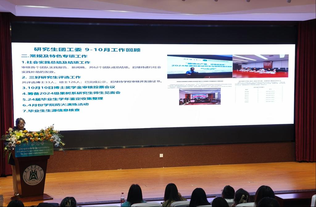 研究生会主席团成员谭灵进行了个人陈述。简述了研究生会管理模式的转变,相较于往年更精简,更深入。此外,谭灵也对研究生会四大部门近期工作进行了总结汇报。