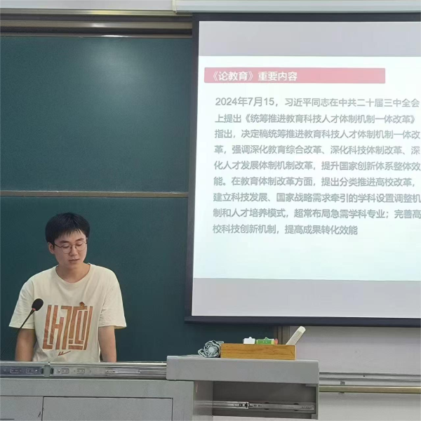 在本次主题党日活动中,丁彪同志带领大家学习了四个方面的内容:二十届三中全会精神、《论教育》重要内容、《关于人才工作论述摘编》以及《流动党员管理工作的意见》。