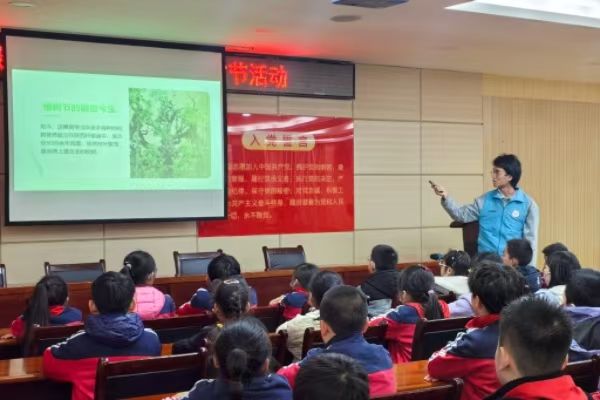 伴着小朋友们期待的目光,志愿者林浩宇以一个问题拉开本次活动序幕。“大家知道昨天是什么日子吗?”“植树节!”话音未落,在场的同学们争先恐后地脱口而出。通过图文并茂的展示,小朋友们了解到植树节的由来、世界各地有趣的种树习俗以及树木自身被赋予的对繁荣和平的希冀。那么树木在我们生活中有什么作用呢?“可以隔音!”“可以供我们乘凉!”“树木的根部可以吸水,下雨天不用担心发洪水了!”小朋友们积极举起小手,各种想法层出不穷。在兴致勃勃地倾听小朋友们的观点后林浩宇向大家介绍了树的其他作用,并通过关于梭梭树的科普视频重点介绍了其在防风固沙工程中的重要作用,引来阵阵赞叹。根据计算,一棵树的生态价值约合人民币140多万元,这一庞大的数据同样使在场的小朋友们感到震撼,深刻认识到植物在生态保护中的重要性。